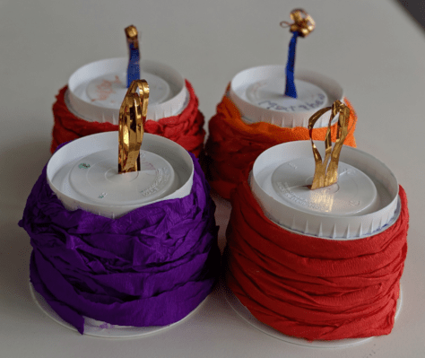- Put glue all over the yogurt container. Stick the twisted crepe paper around.